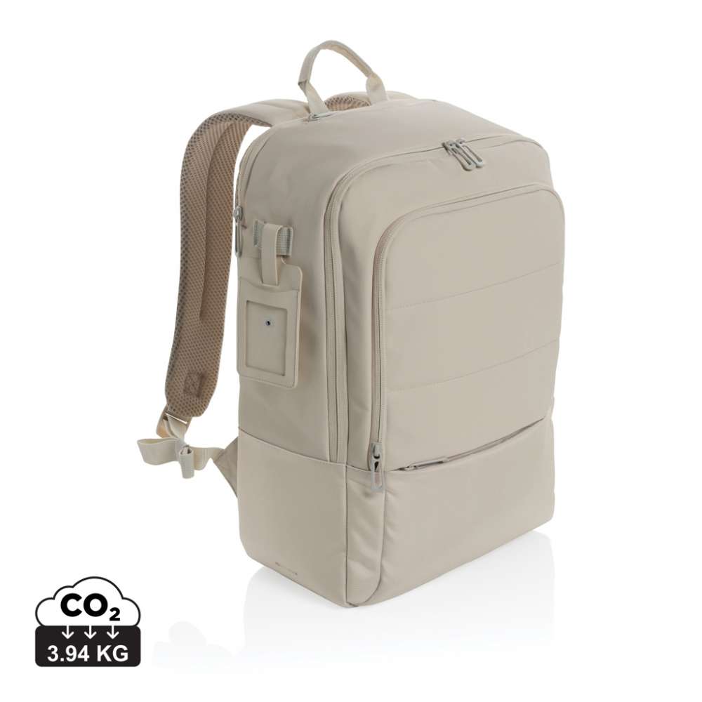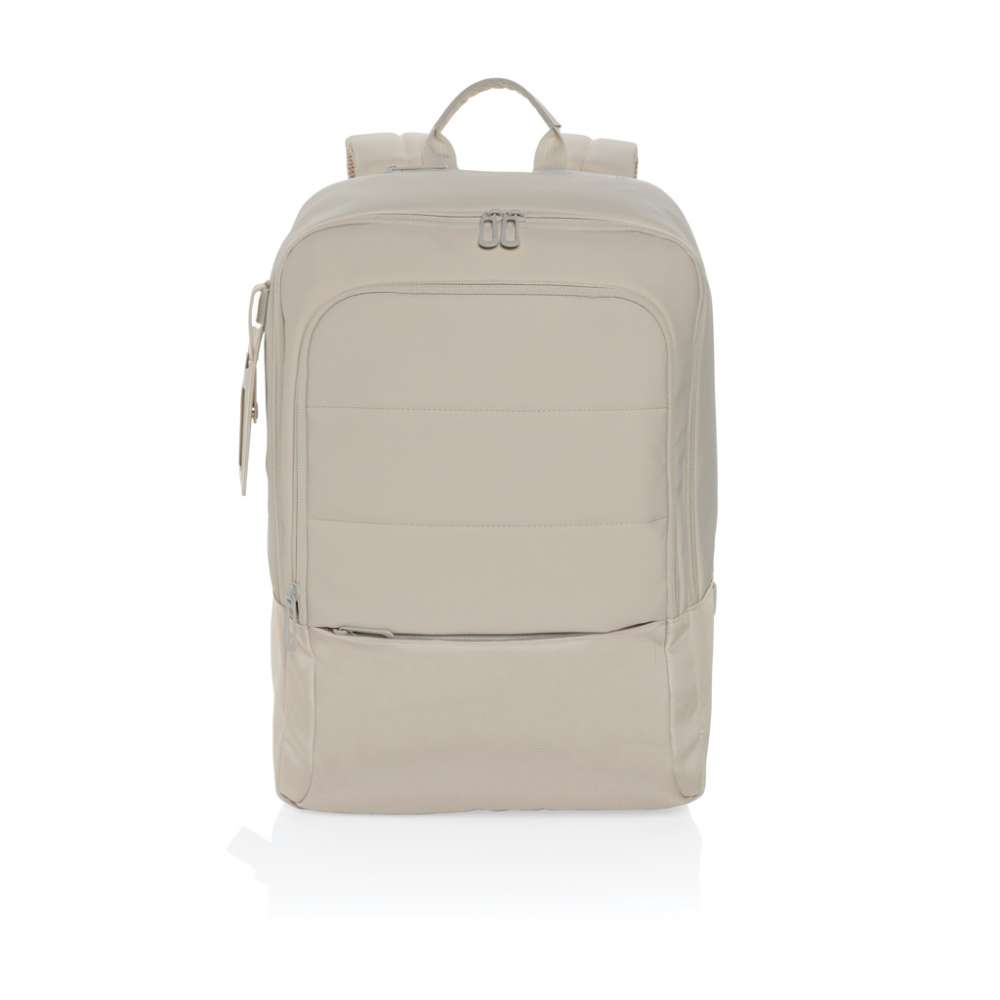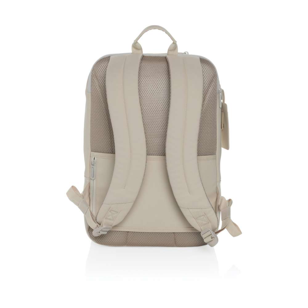 Den rena designen gör ryggsäcken mycket mångsidig och idealisk för både arbete och fritid. Den är stilig nog för styrelserummet, men erbjuder ändå all den bekvämlighet och komfort som en ryggsäck har. Vadderat laptopfack med plats för 15.6′ laptop. Plocka enkelt fram viktiga saker som pass, biljett eller smartphone i säkerhetskontrollen via den praktiska, lättåtkomliga toppfickan. De invändiga nätfickorna håller ordning på dina småsaker. Det finns en bagagetagg på sidan. Tillverkad av återvunnen polyester med AWARE™-spårning. 2% av intäkterna från varje såld produkt med AWARE™ kommer att doneras till Water.org. PVC-fri.