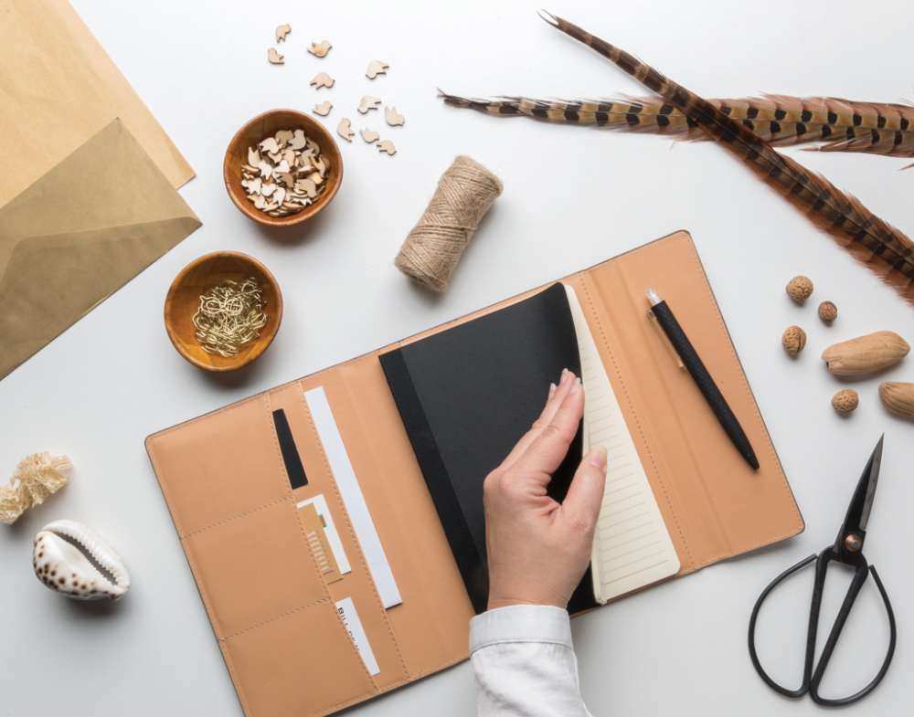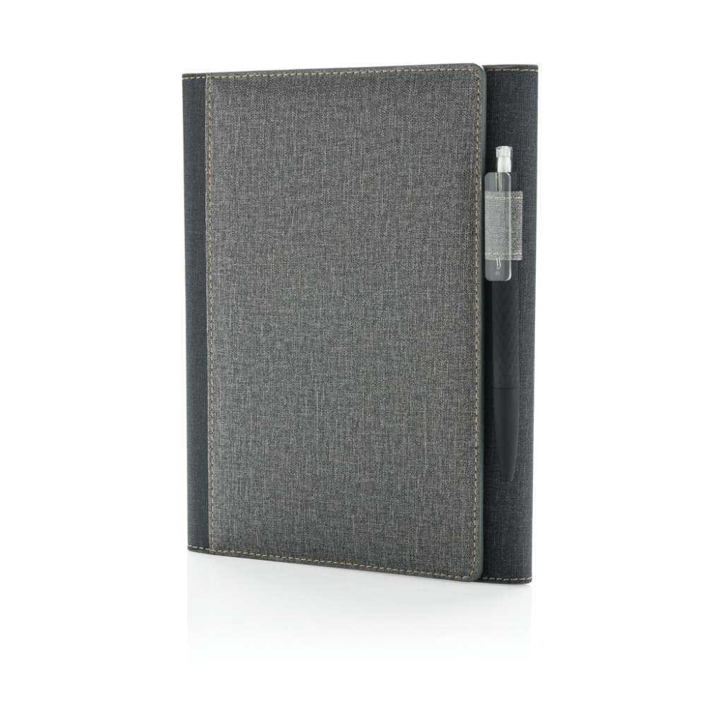 A5 fodral med magnetstängning och pennögla, insida med tre kortfack och ett större fack. Anteckningsbok med 128 cremefärgade sidor, 80 g/m2.