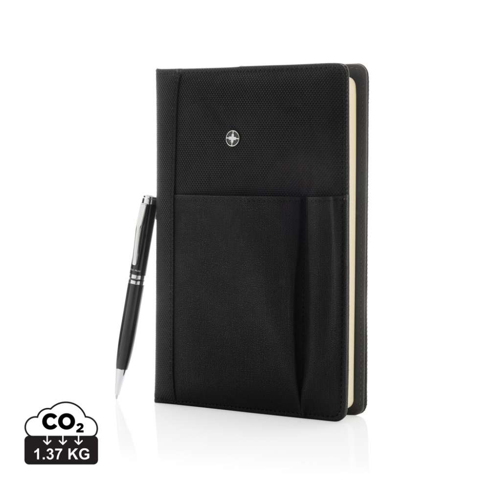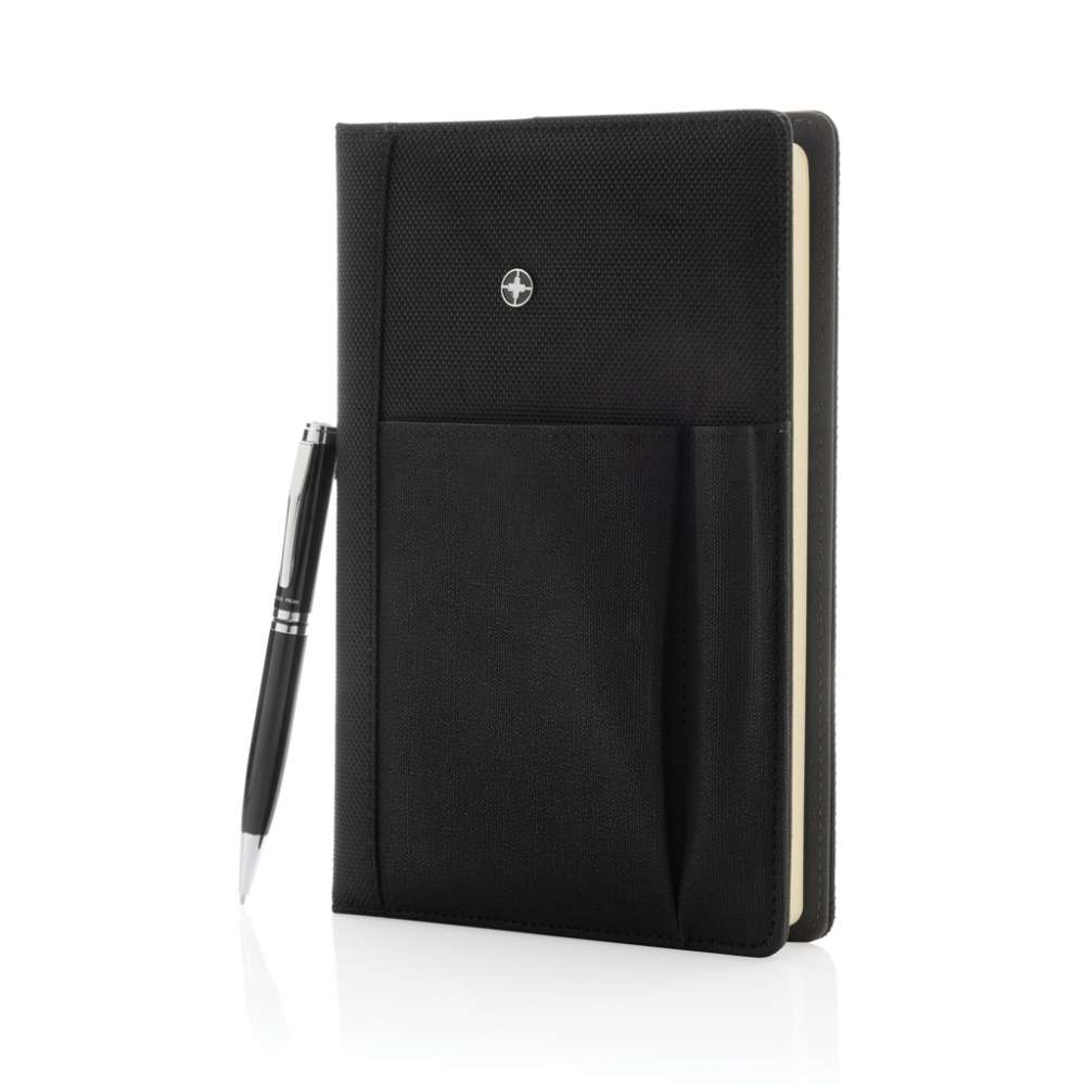 Swiss Peak Executive anteckningsbok i 1680D och 600D polyester. Utbytbar anteckningsbok så omslaget kan användas på nytt. Mobilficka på omslaget, samt pennfack och ficka för kort, kontanter etc. Levereras i Swiss Peak presentförpackning.