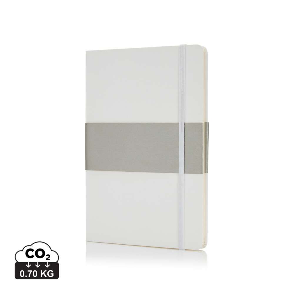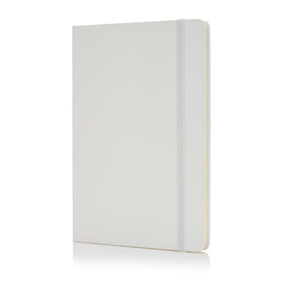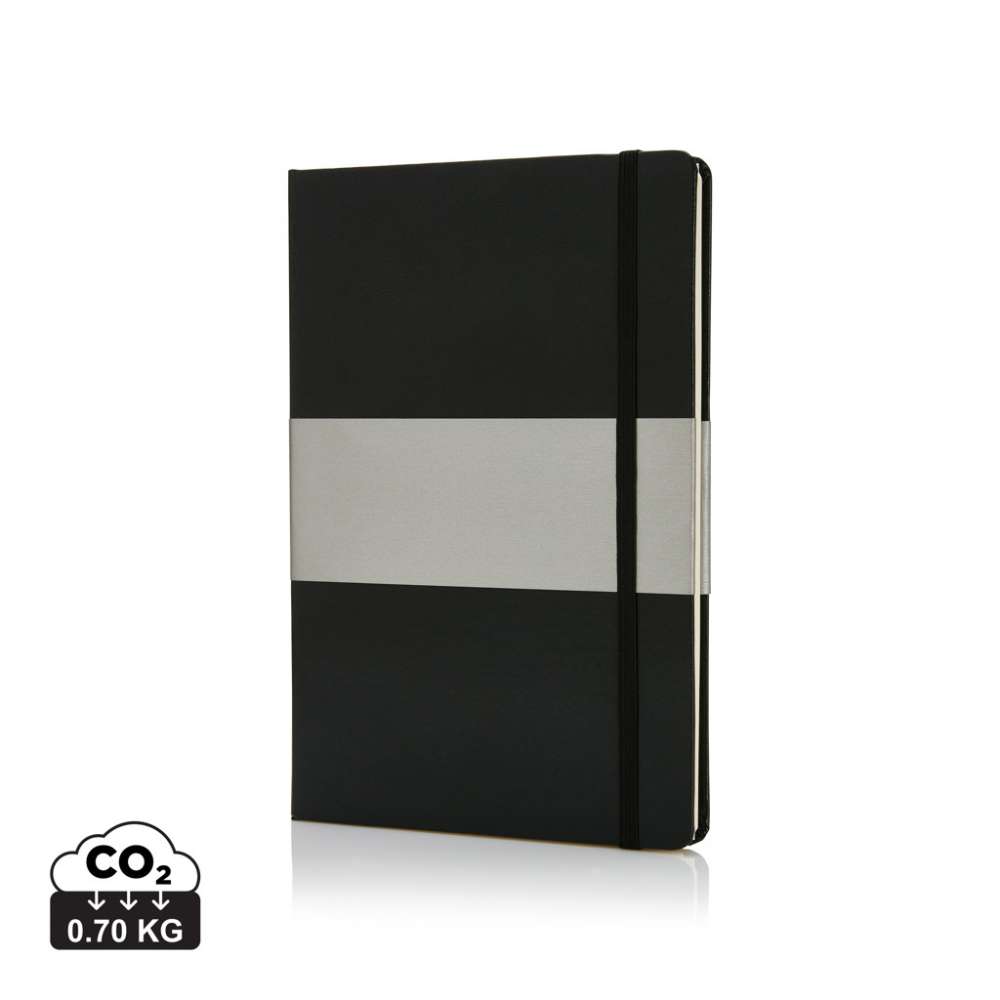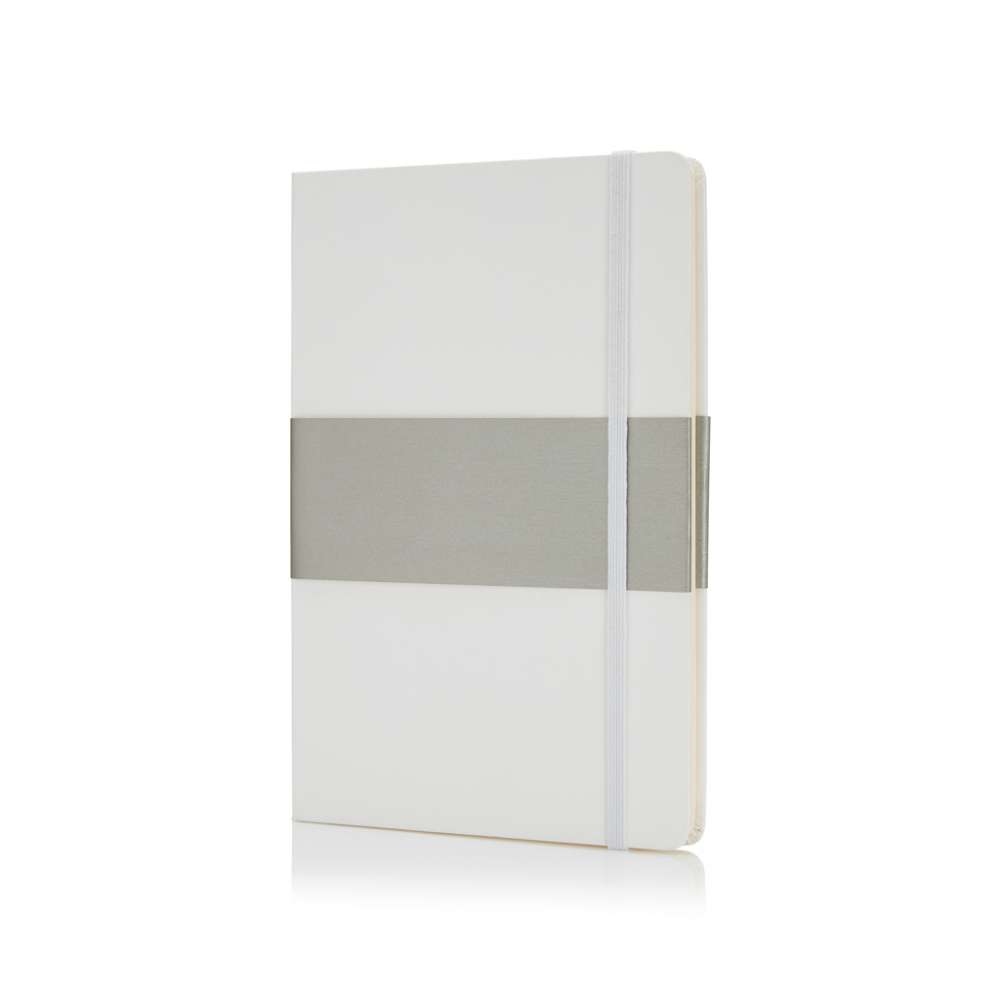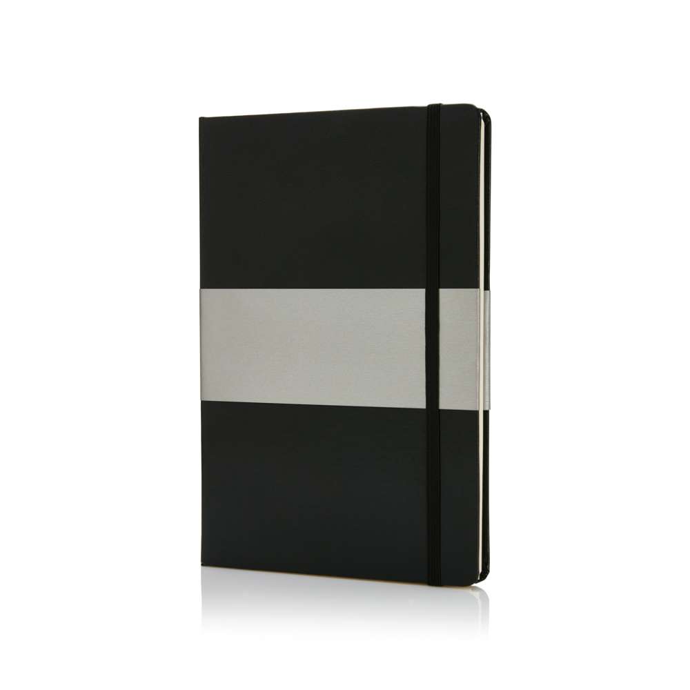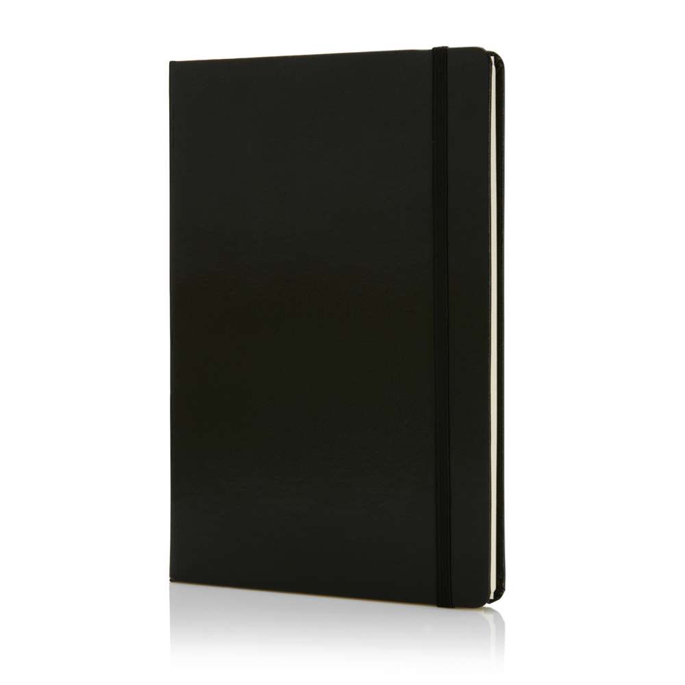 A5, 160 st gula papper (80gr) med svart linjering. Siddelare och elastiskt band att fästa runt blocket.