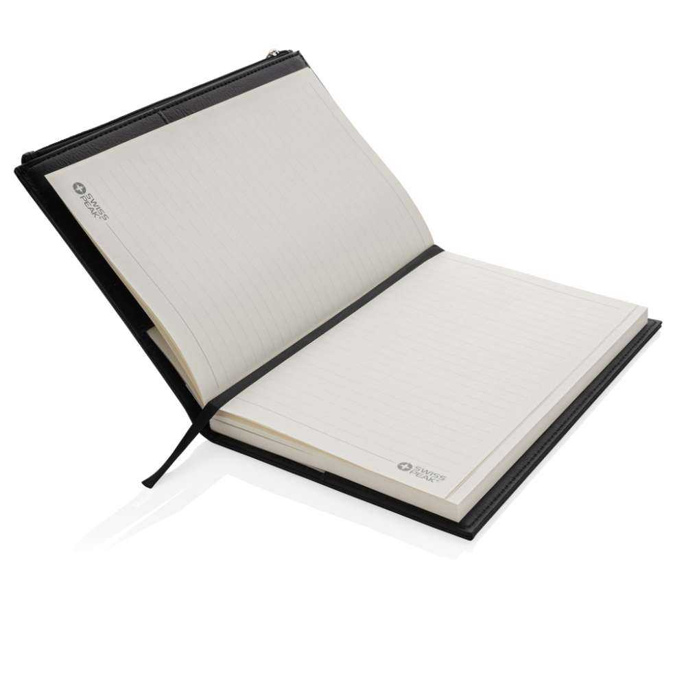 Swiss Peak A5 PU anteckningsbok har ett blixtlåsförsett fack på framsidan. 80 blad/160 sidor krämfärgat linjerat 80 gsm papper. Levereras i lyxig presentförpackning.