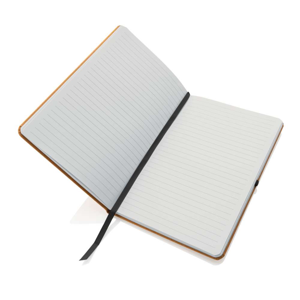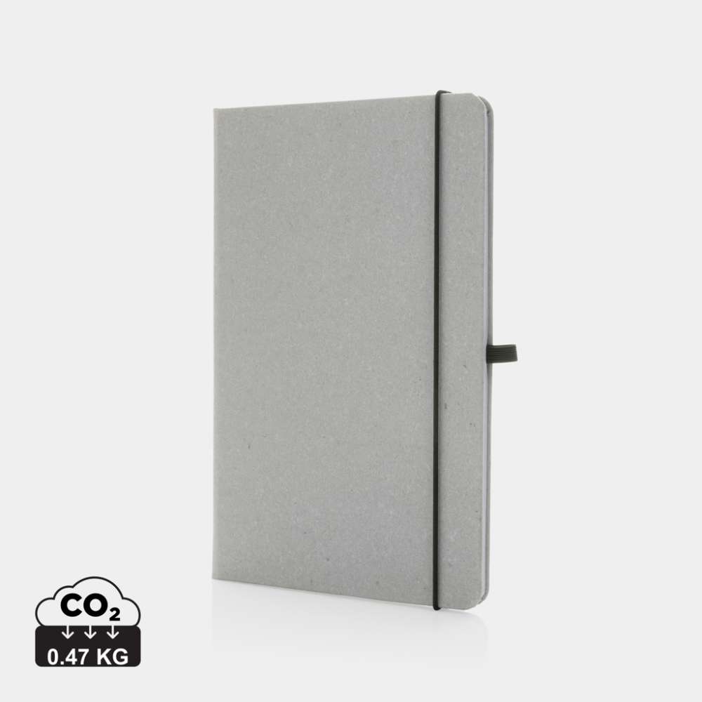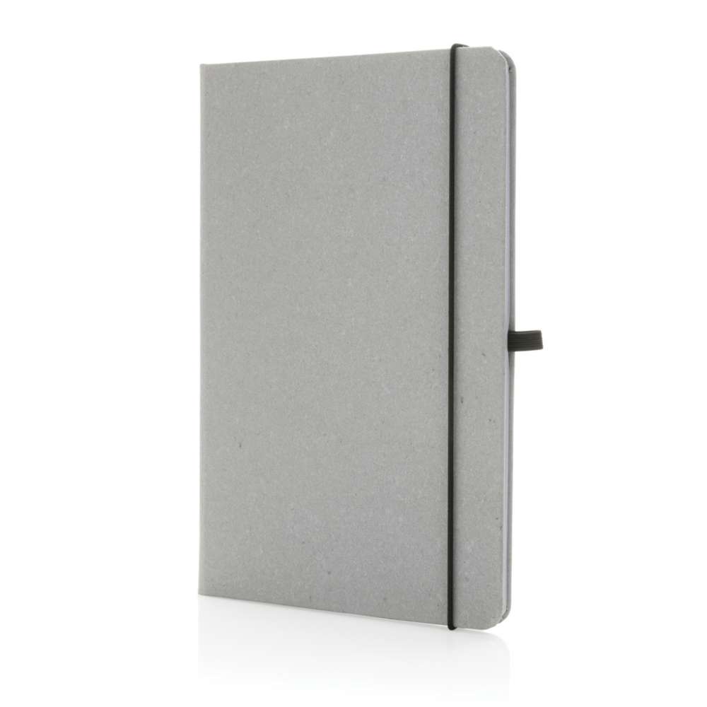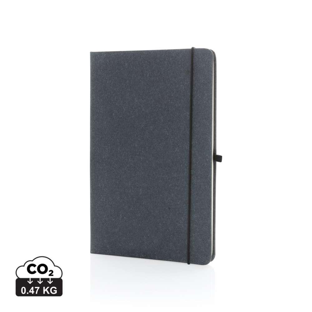 A5 hardcover anteckningsbok i återvunnet läder. Med 80 blad/160 sidor linjerat krämfärgat återvunnet papper, 70 g/m2. Med vertikalt elastiskt band och pennögla. 77% GRS-certifierad återvinning (återvunnet läder och återvunnet papper). Plastfritt förpackat i FSC-fodral.