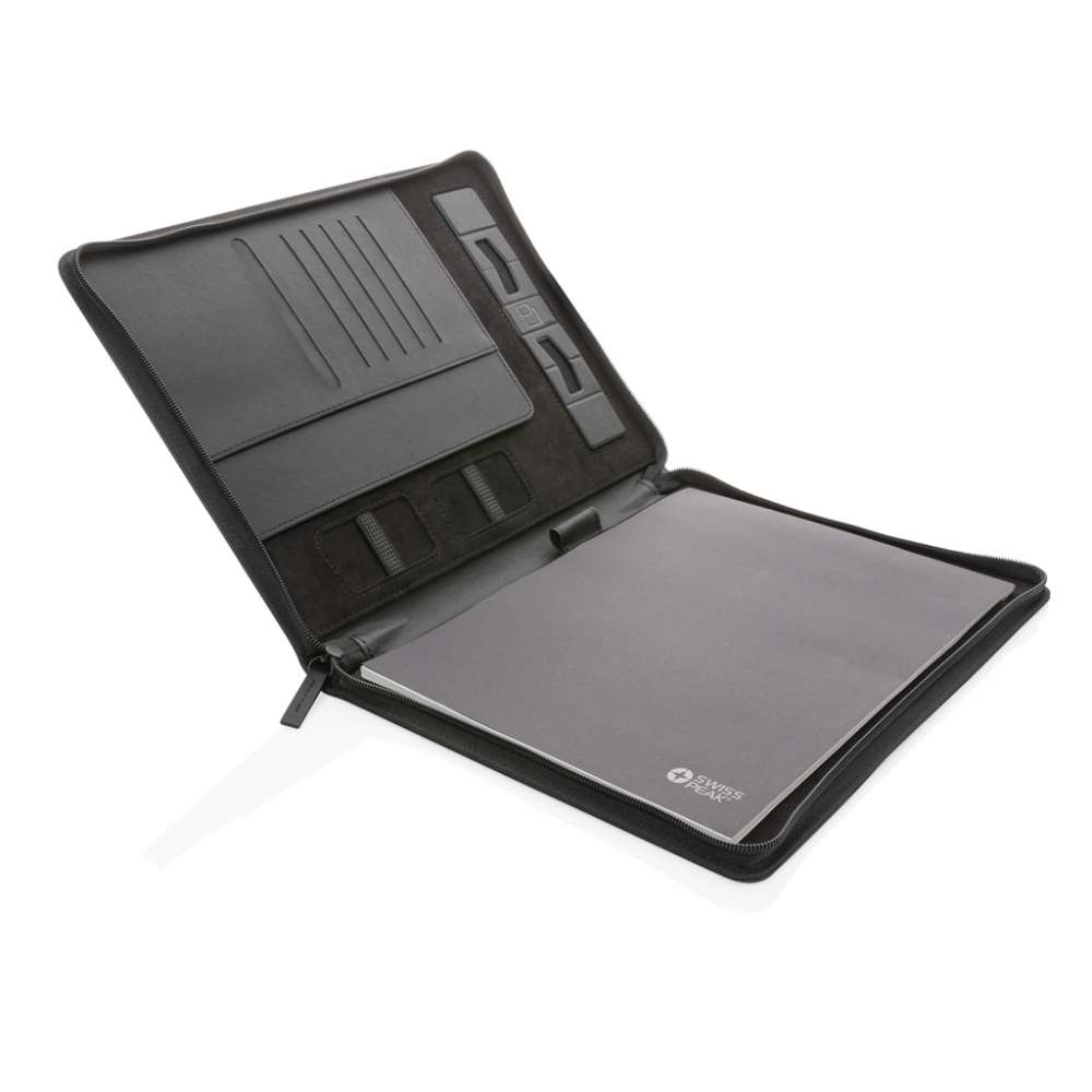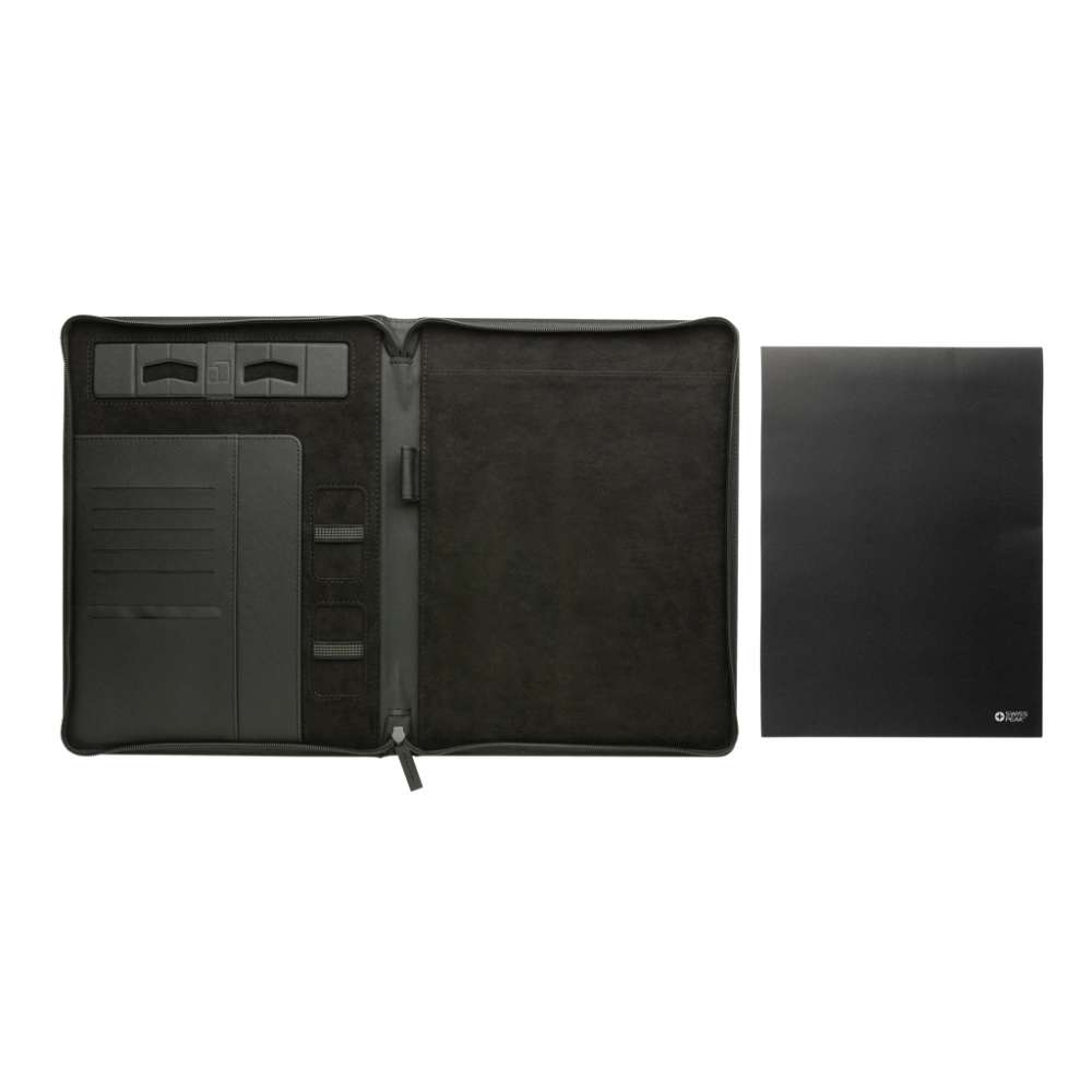 Swiss Peak Heritage kollektionen utstrålar modern elegans. Portfolion har en dragkedja, på insidan finns surfplatta/mobiltelefon-fack, hållare för dina tillbehör, visitkortsfack, dokumentfack och penn-loop. A4 stenpapper anteckningsblock medföljer, 20 blad vitt linjerat papper. Tillverkad av RCS (Recycled Claim Standard) certifierade återvunna material. RCS certifiering säkerställer en helt certifierad leveranskedja av de återvunna materialen. Tillverkad av RCS certifierad återvunnen PU. Totalt återvunnet innehåll: 9% baserat på total produktvikt. PVC-fri.