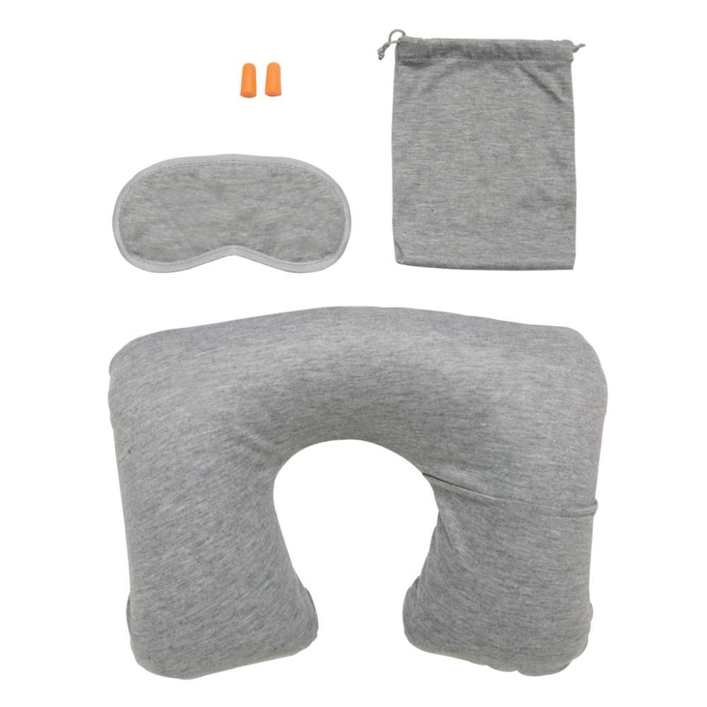Mjukt reseset innehållande en uppblåsbar nackkudde med ficka för mobil eller hörlurar, ögonmask, mjuka öronproppar och en mjuk påse med dragskostängning.