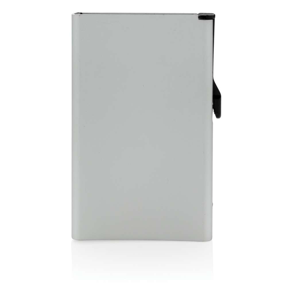 Solid RFID korthållare i aluminium med plats för upp till 10 kort eller 6 kort med embossing. Reglaget på sidan skjuter gradvis fram korten.