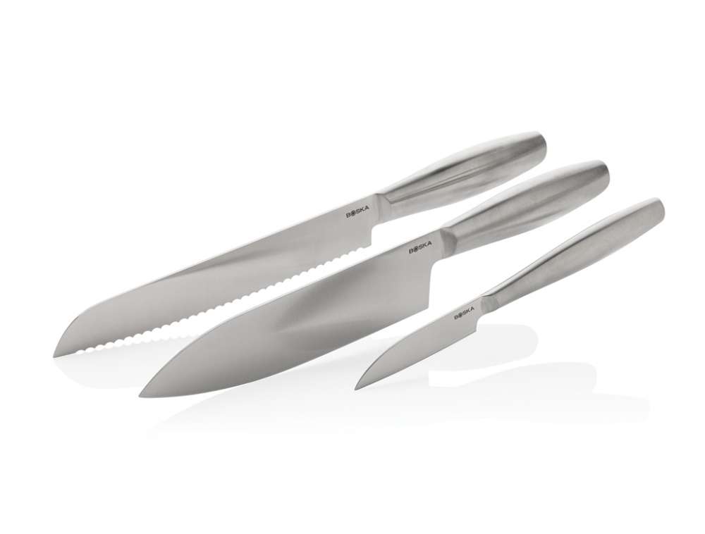 Skär alla typer av mat med lätthet med Kitchen Knives Copenhagen, från varumärket BOSKA – ett B Corporation-certifierat företag. En uppsättning av tre vassa och viktiga knivar med en unik design och tillverkade helt i rostfritt stål. Lätt, diskmaskinssäker och med ett ergonomiskt handtag som är anpassat till olika skärtekniker och livsmedel. Gjorda för att hålla livet ut