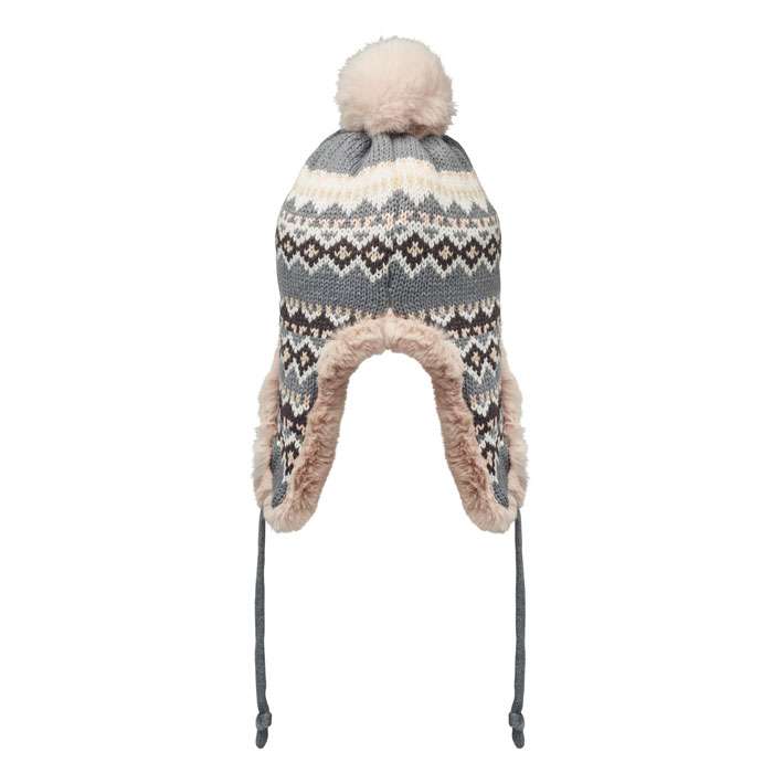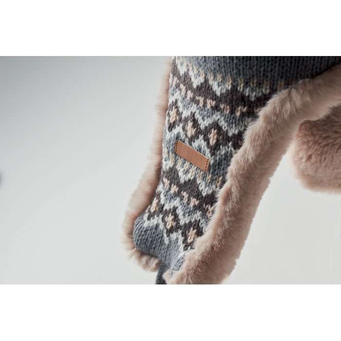 Stickad mössa med öronlappar och tofs i akrylfiber med polyester- och fleecefoder. Inklusive etikett för tryckyta på ena sidan. Storlek vuxen (58cm).