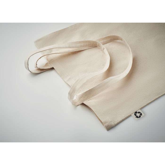 Kasse i återvunnen bomull (65 % återvunnen bomull, 35 % vanlig bomull) med långa handtag. 140 gr/m².