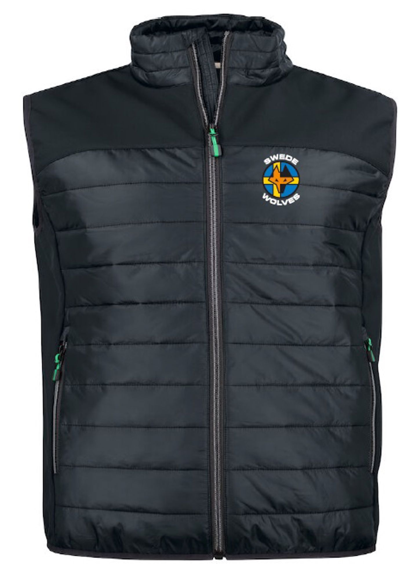 Softshell/ lättvikts väst. Oket, sidopaneler fram & bak av softshell (tyg 1). Bål, fram & bak av vadderat lättvikts material (tyg 2).