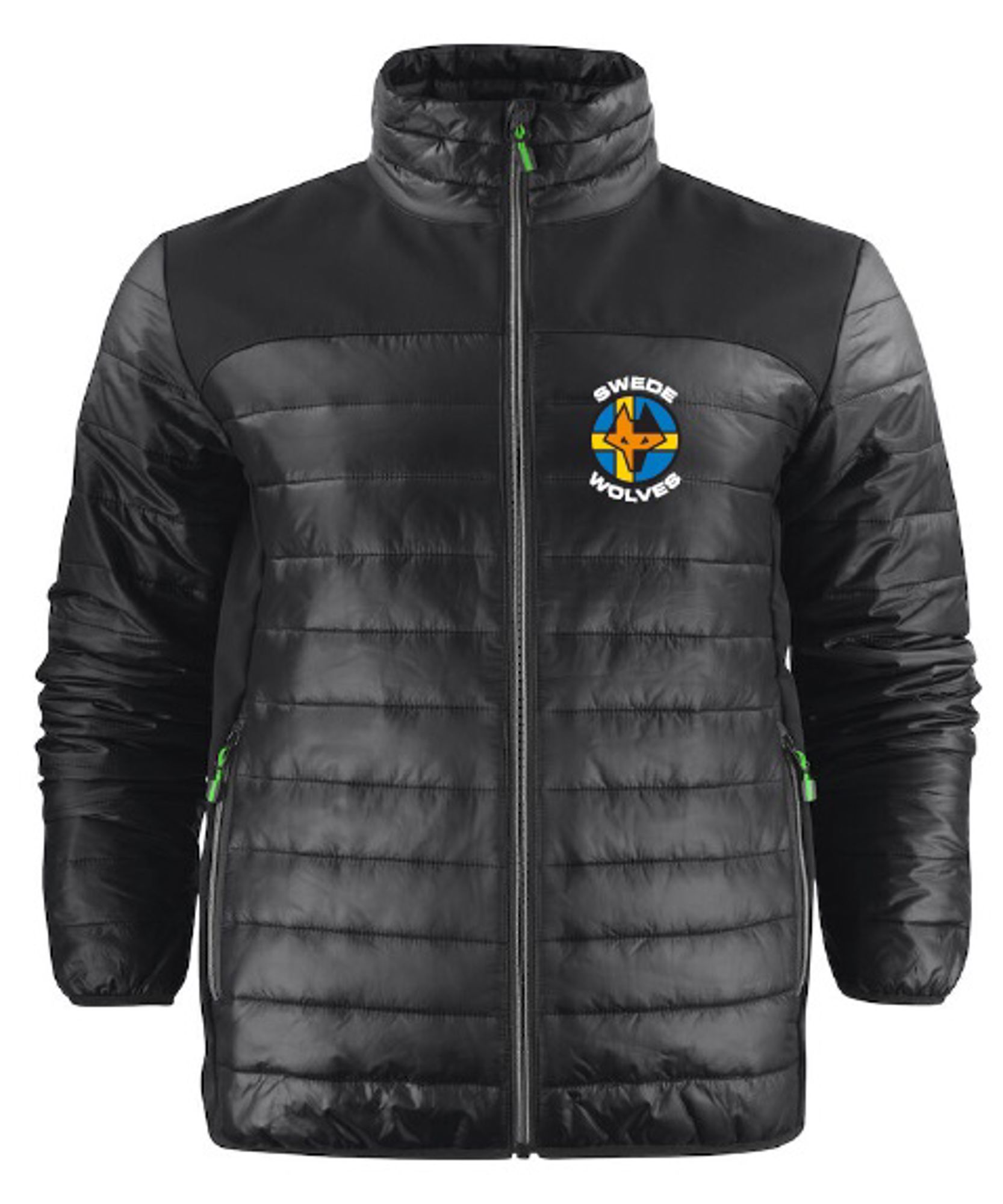 Softshell/lättviktsjacka med ok och sidopaneler i softshell (tyg 1). Bål och ärmar av vadderat, lättviktsmaterial (tyg 2). Blixtlås och zip pullers i Printer Essentials-manér.